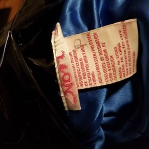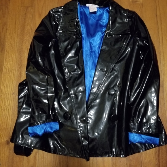 Black vinyl with bright blue lining. Large buttons. Buckle details on wrists. Beloved jacket that I will never fit into again, needs a new home.