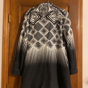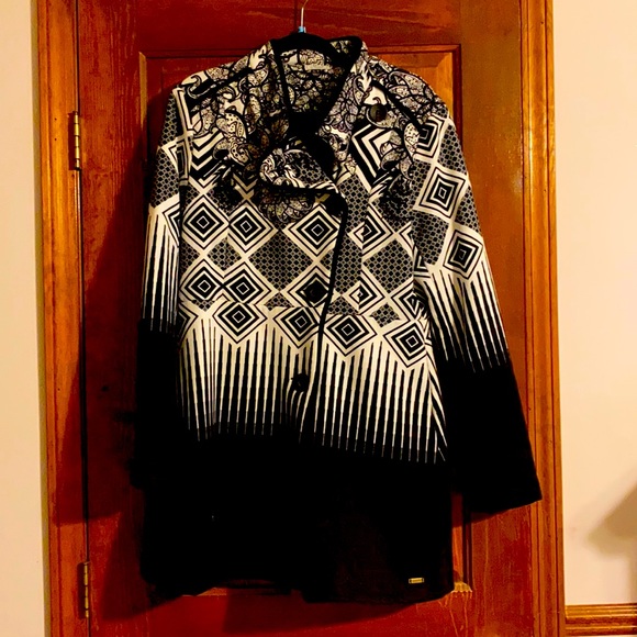 Sweatshirt type material. Super fun, classy jacket. Definitely a statement piece.