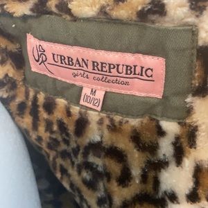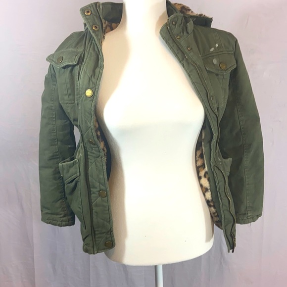 Kids green winter jacket leopard print inside dark green outside there is a little bit of white paint on it