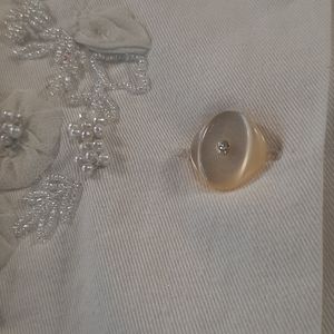 ANAGE TOO Lovely off white 5 button jacket with intricate pearl and silver leaf details on front back and sleeves. Elegant for evening or a great dress up for a pair of jeans.