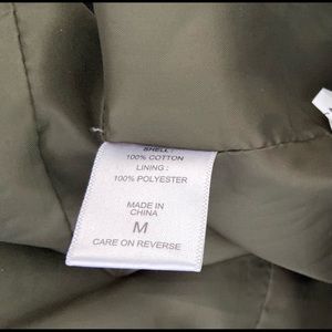 Olive jacket. Never worn. Zipped in hood. Has great pocket detail lots of zippers and draw string at waste. Medium weight. Looks great with jeans joggers or even long dress/skirt. Not another out their like this one. Friends will compliment your taste