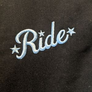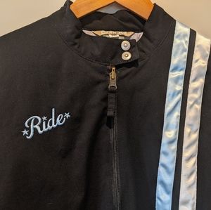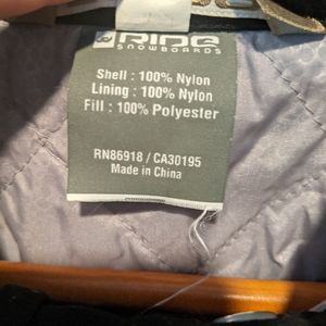 Light jacket, no insulation. Zip up front, snap neck, with hand pockets. Light gray lining, black with pale pink and pale blue stripes on the front. Embroidered blue Ride snowboard logo. Back logo is printed and embroidered. No snags or frays in the stitching. A small light-colored spot on the front, right side on the waist (as worn), please see pictures for details.