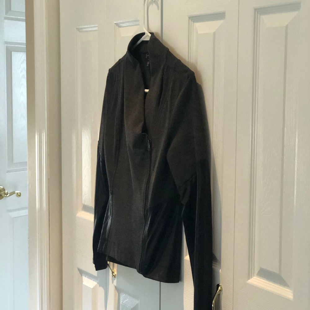 Zipper is off center sleeves from elbow down is faux leather