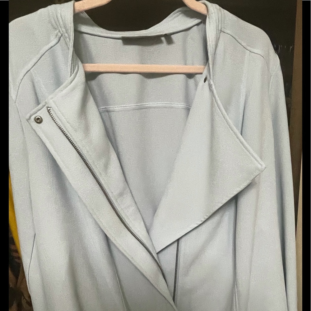 Machine wash, baby blue Morto Jacket. Feel lovely on the skin. Zipper front with fly lapel. Rubber band slightly twisted. An easy fix.