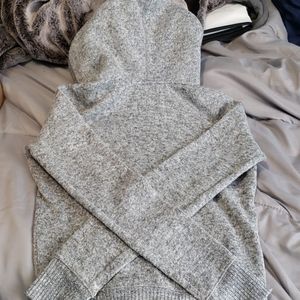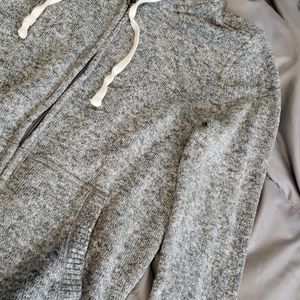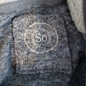 Light amd dark gray marbled jacket with fluffy hood that is still pretty fluffy, there is a small blend stain next to the right pocket, not to noticeable, anyone with the right laundry techniques could probably get it out I just didnt want to mess it up more.