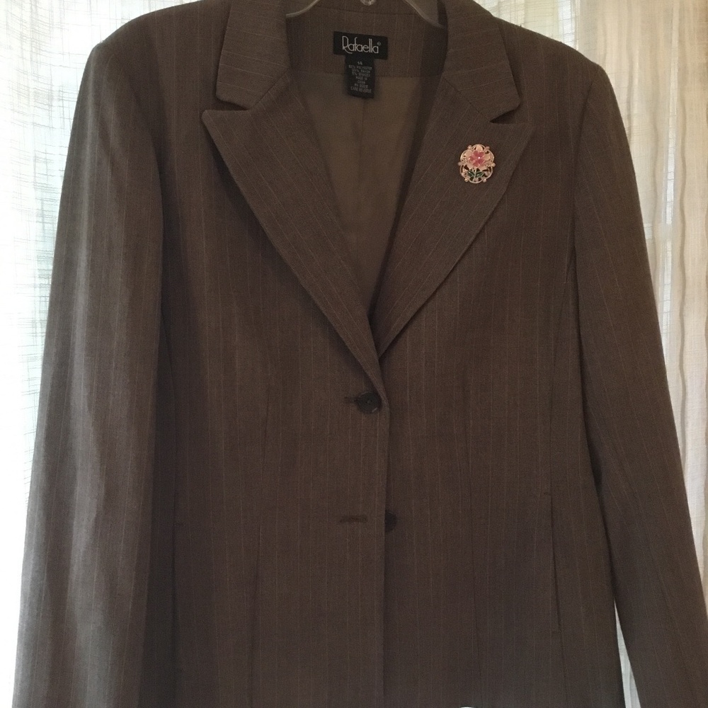 Stylish jacket medium brown with soft subtle stripe. Two button closure, fully lined. Worn once. Broach optional.