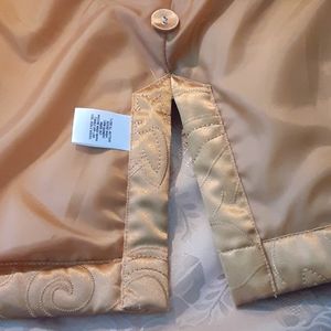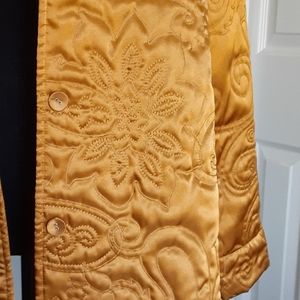 Beautiful, light weight quilted jacket has a satiny look with a stitched design and a stand up collar. It has a 5 buttons covered in matching fabric. The jacket length is 26in. and the sleeves are 23in. It measures 22in. from pit to pit. This jacket has been previously loved and well cared for. ❤