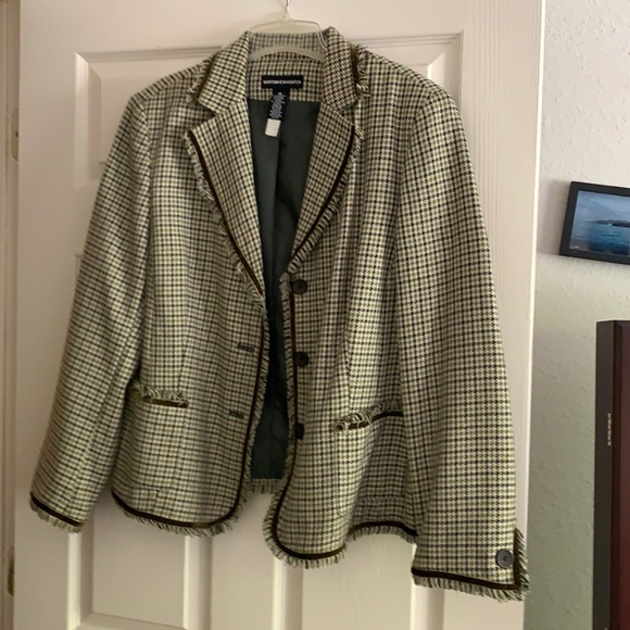 Green snd black checked jacket.