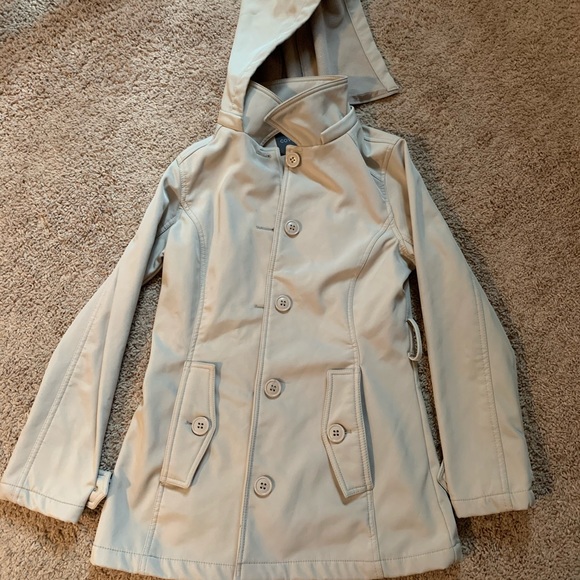 Tan/cream jacket in good shape, never worn. The hood zips off if needed.