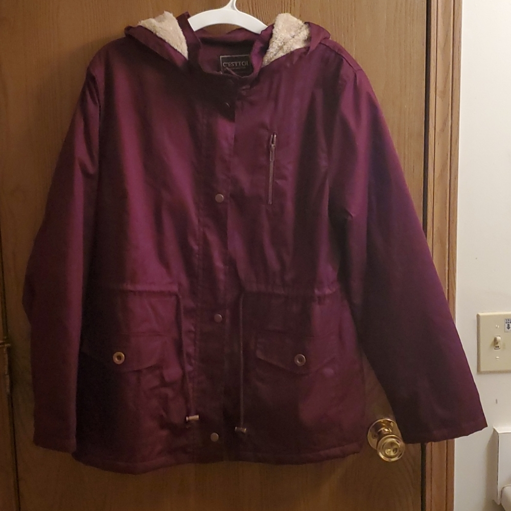 Burgundy, size M, 100% cotton outside and 100% polyester fake fur lining.