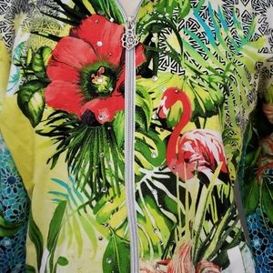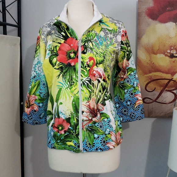 Nice woman's jacket it has rhinestones size LG very comfortable and stretchy very pretty