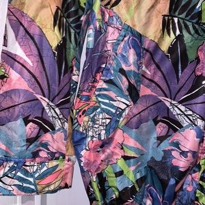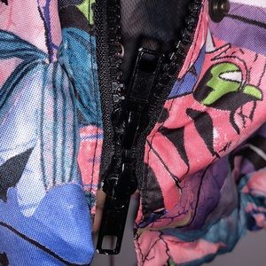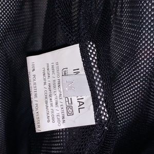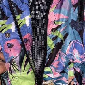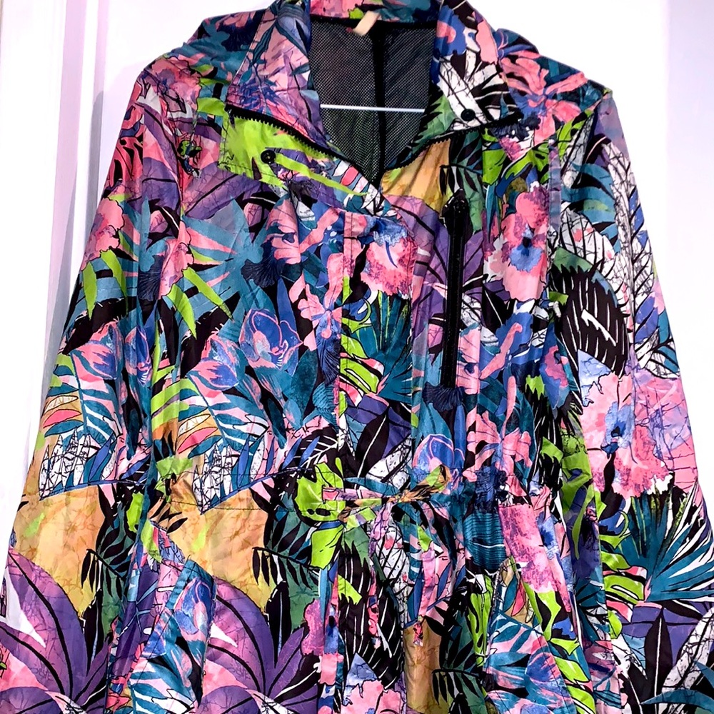 Beautiful windbreaker or raincoat lined with mesh. Hoodie attached, can be hidden. Excellent stitching and detail snap on closures with plastic zipper. Feels great to the touch. Gathered at the waist for comfort level. Made in Italy.