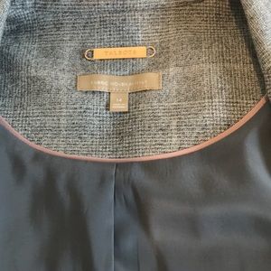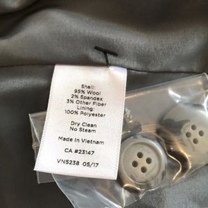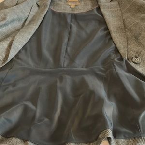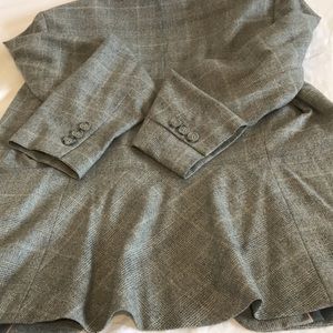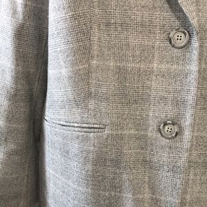 Gray glen plaid tailored jacket with back peplum waist. 2 button front closure, 3 buttons on long sleeves. Pockets