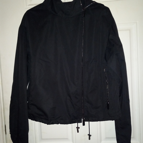 Bally black jacket with a hood. Jacket has a bag attached for the jacket to fit in. Jacket is a size 12 in great condition. Materials is 63%cotton and 37% nylon.