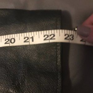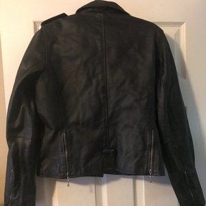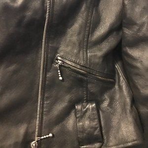 Black zipper leather jacket, the jacket is long sleeve with zippers at the end, hem, and has pockets. EUC