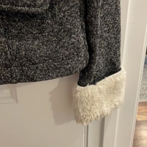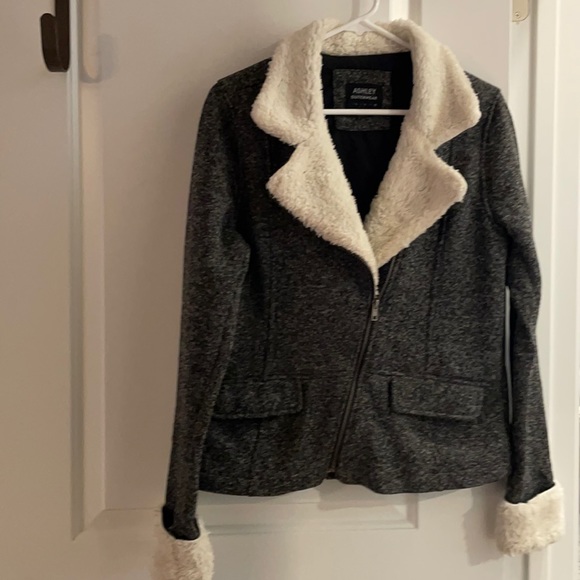 This jacket is so warm!!! Gray and white with shearling down sides and on sleeves! Zips up! Fits fabulous!