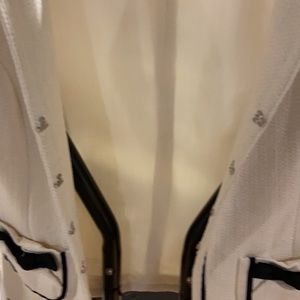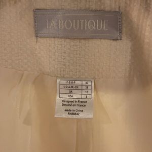 Jacket with Cute details. Bows on pockets and a grosgrain ribbon trim. Heavy duty hook and eye closure. Looks great in the office or with jeans. Very versatile. Some slight discoloration on inside at the armpits. Worn with a black tee that must have rubbed off