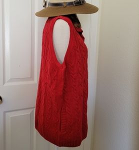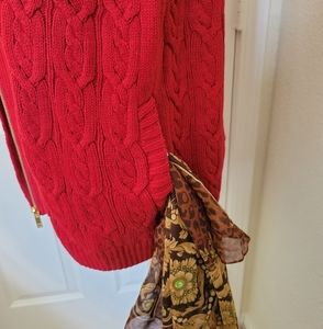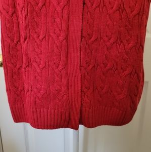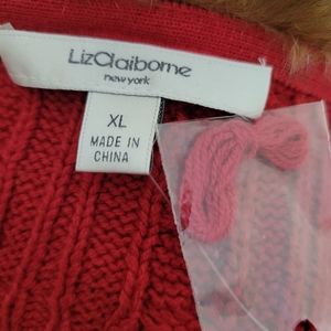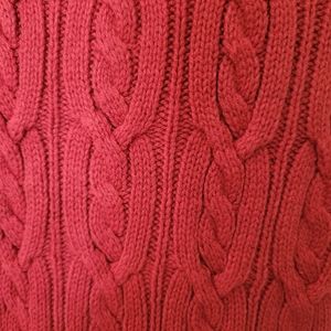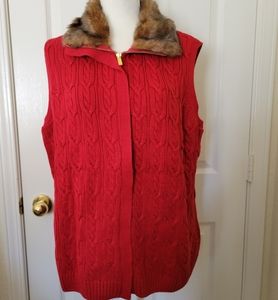 Dark red color. Front zipper. 2 side pockets and faux fur collar. Attached red treads if needed. Never worn