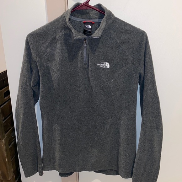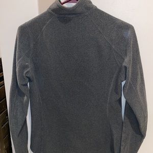 1/4 zip grey fleece pullover. Shows some wear, but in decent condition and still has life left. Super cozy. Runs pretty true to size.