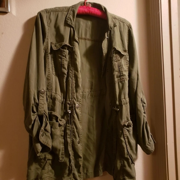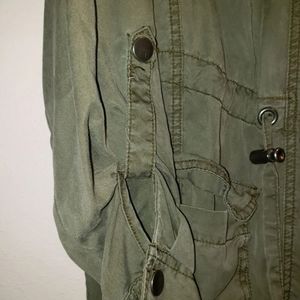 Shirt/jacket with tie & snaps. Olive green. Can be long sleeve or folded up & buttoned. Size small. Only worn once.