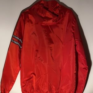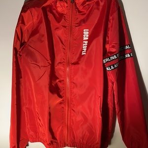 Red jacket, really good for running and very flexible, block wind and is stretchy. Visible at night and is very stylish. Rain jacket, medium