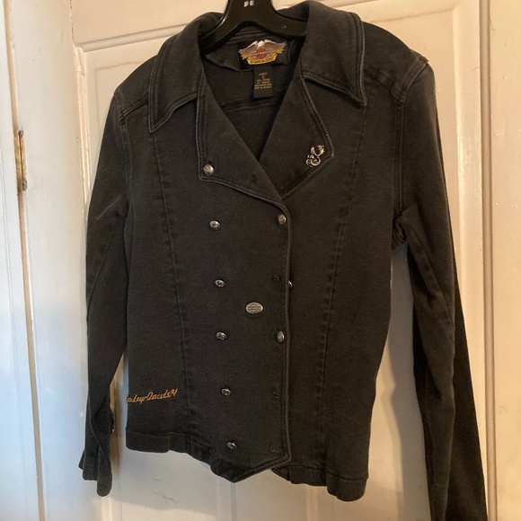 Black jean jacket with silver buttons. Double breasted.
