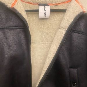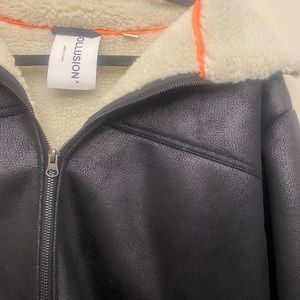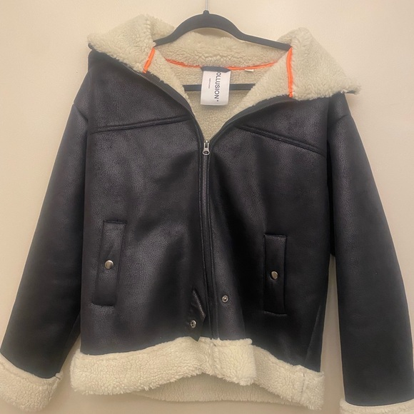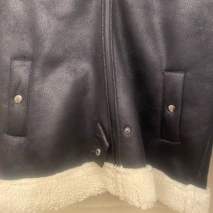 Black leather look jacket, adorable jacket with no flaws at all, never been worn, super warm and cozy on the inside. Price is negotiable, let me know if ur interested