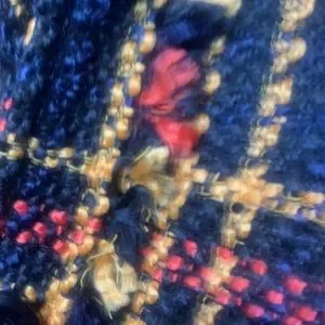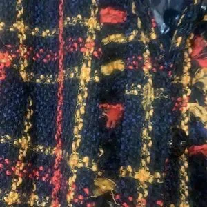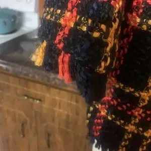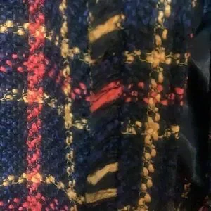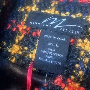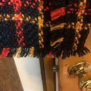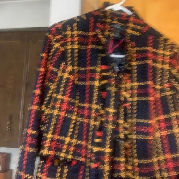 Black yellow and red plaid fringe look on pockets down front and sleeves p to p is 19 length is about 33