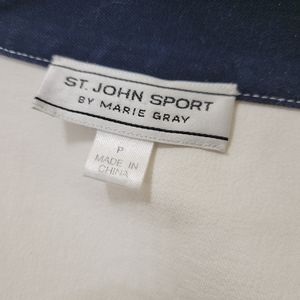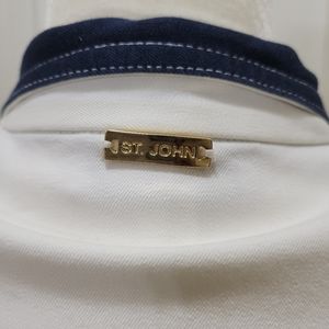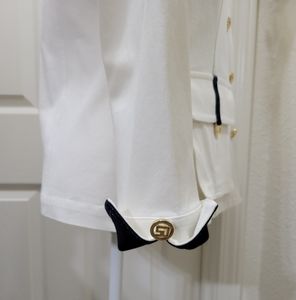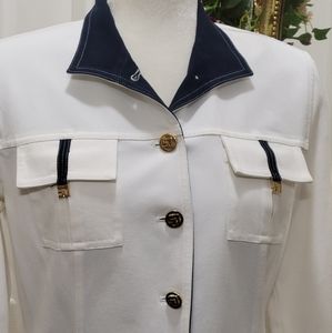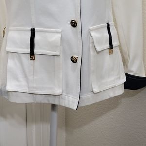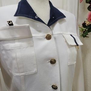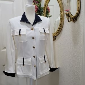 Very cute jacket. 6 SJ from buttons, 4 front flap pockets with SJ logos. Navy blue color on cuffs and collar. Shoulder pads and back darts