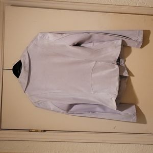 Gray jacket with hooks in the front.