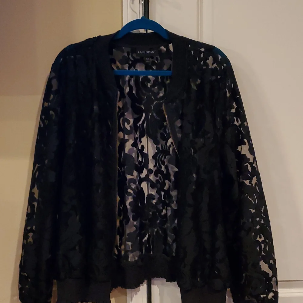 Black paisley bomber jacket. Still in excellent condition, very pretty. The size is actually 26/28