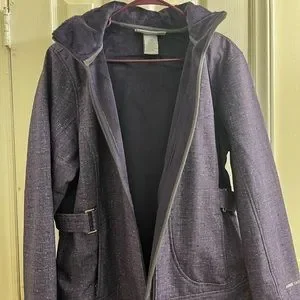 Fleece lined jacket, water proof. Has hood and pockets. Can make waist tighter if needed. Never worn.