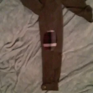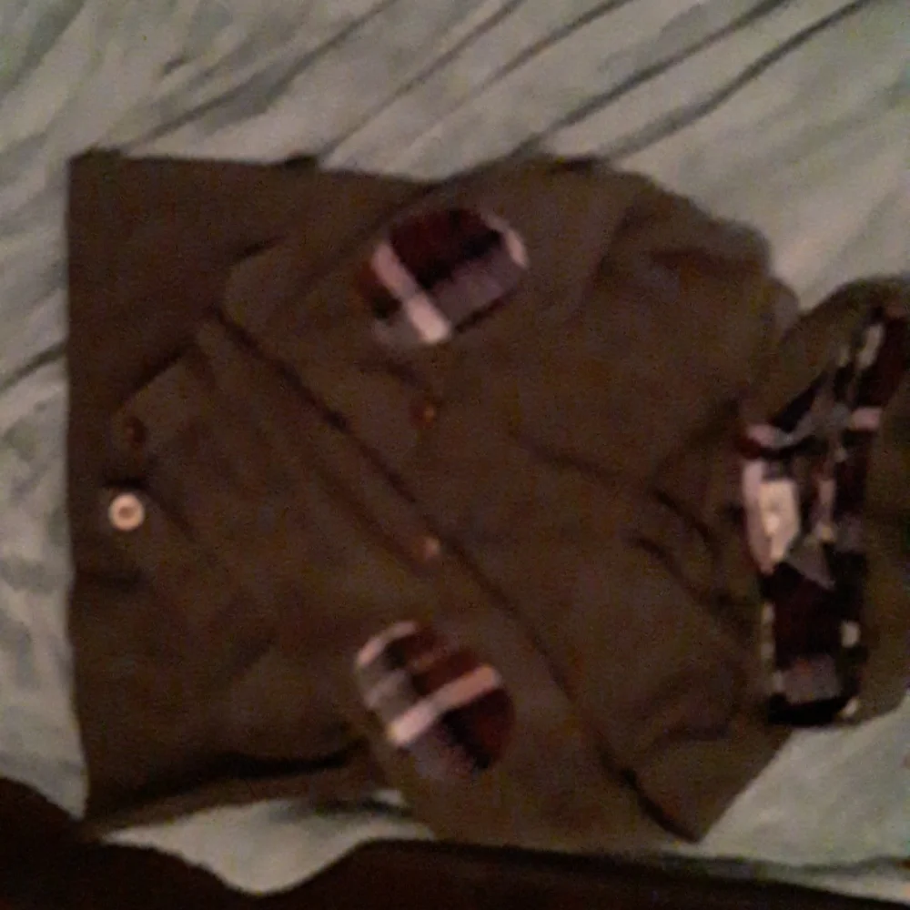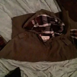 an olive green with the inside is plaid it has little shoulder pad things that are also plaid The Plaid is like a gray blue white and a burgundy color has 4 front pockets but you are fake so really only two front pocket