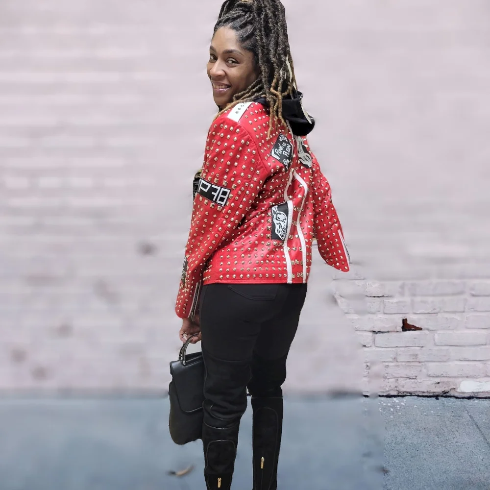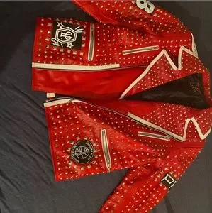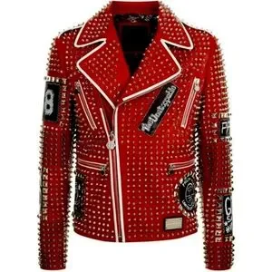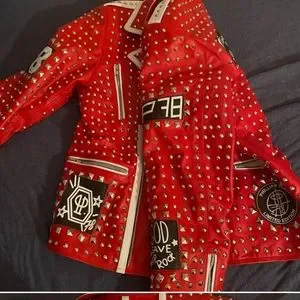 This is a limited edition PHILLIP PLEIN RED LAMB SKIN LEATHER moto jacket. Only worn a few times gorgeous coat with spikes all over expensive coat. I love this coat very heavy insulated. It's a men size small women's xxxl.