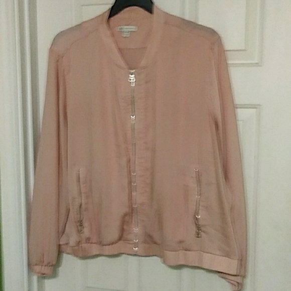 This is a woman's zippered lightweight jacket with 2 zippered pockets. Size 26/28 from Cato. It is 100% polyester in a soft peach color. no holes or tears and from a non smoking home.