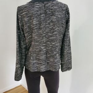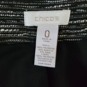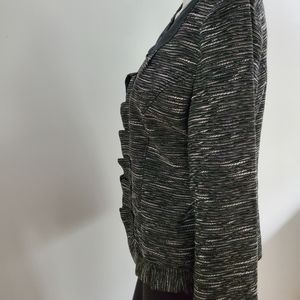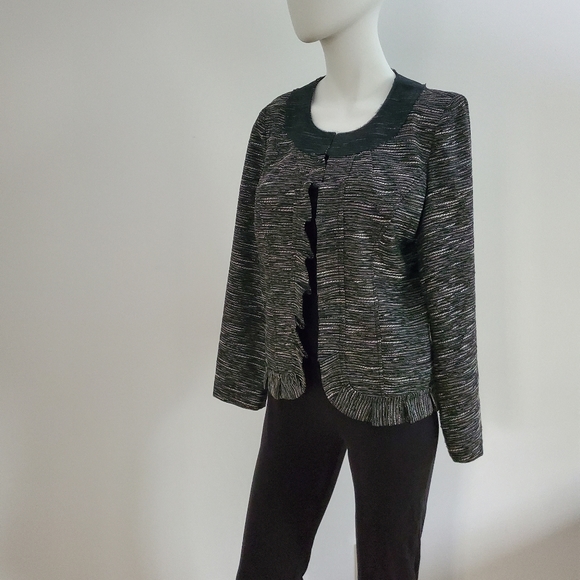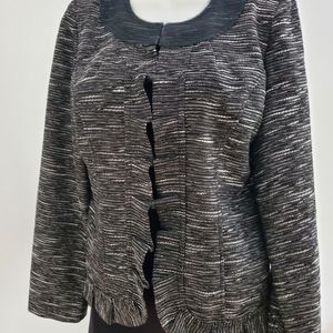 Chicos ruffled trim lightweight short jacket. Black sheer trim detail on neckline. Hidden interior hook and eye closure near neckline. Measurements are: Across back shoulders is 15", sleeve length 24" and jacket length is 20".