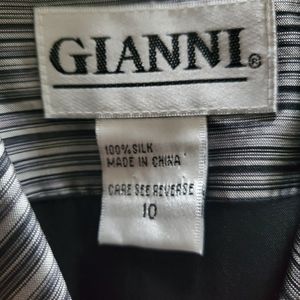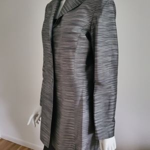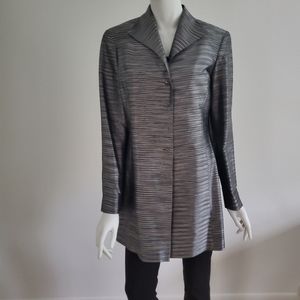 100% Silk long dressy jacket. Front button closure with 4 silver square buttons. Fully lined. Measurements are: Length is 32-1/2", sleeve 24", across back shoulders is 16".
