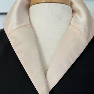 Black silk cocktail jacket with blush pink silk satin collar, lapel and lining. Semi-fitted. 2 black resin button closure. 23.5” in length. Worn only 3 times.