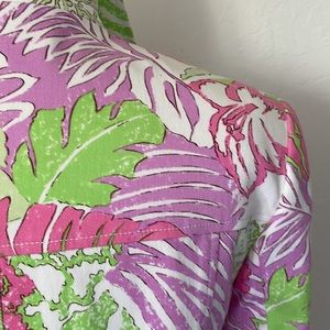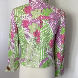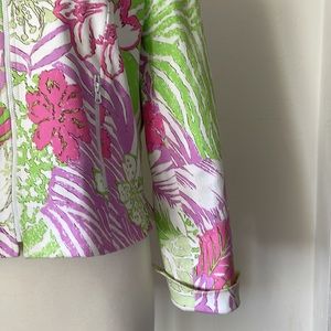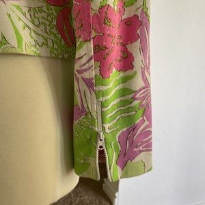 Multi floral cotton(98), lycra(2). Semi-fitted, white zip closure, roll up zip sleeve.