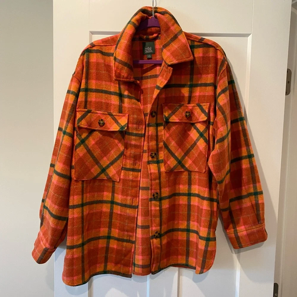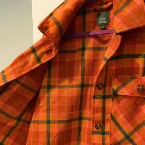 Polyester material perfect condition, like new. Two front pockets, buttons up and comfy!