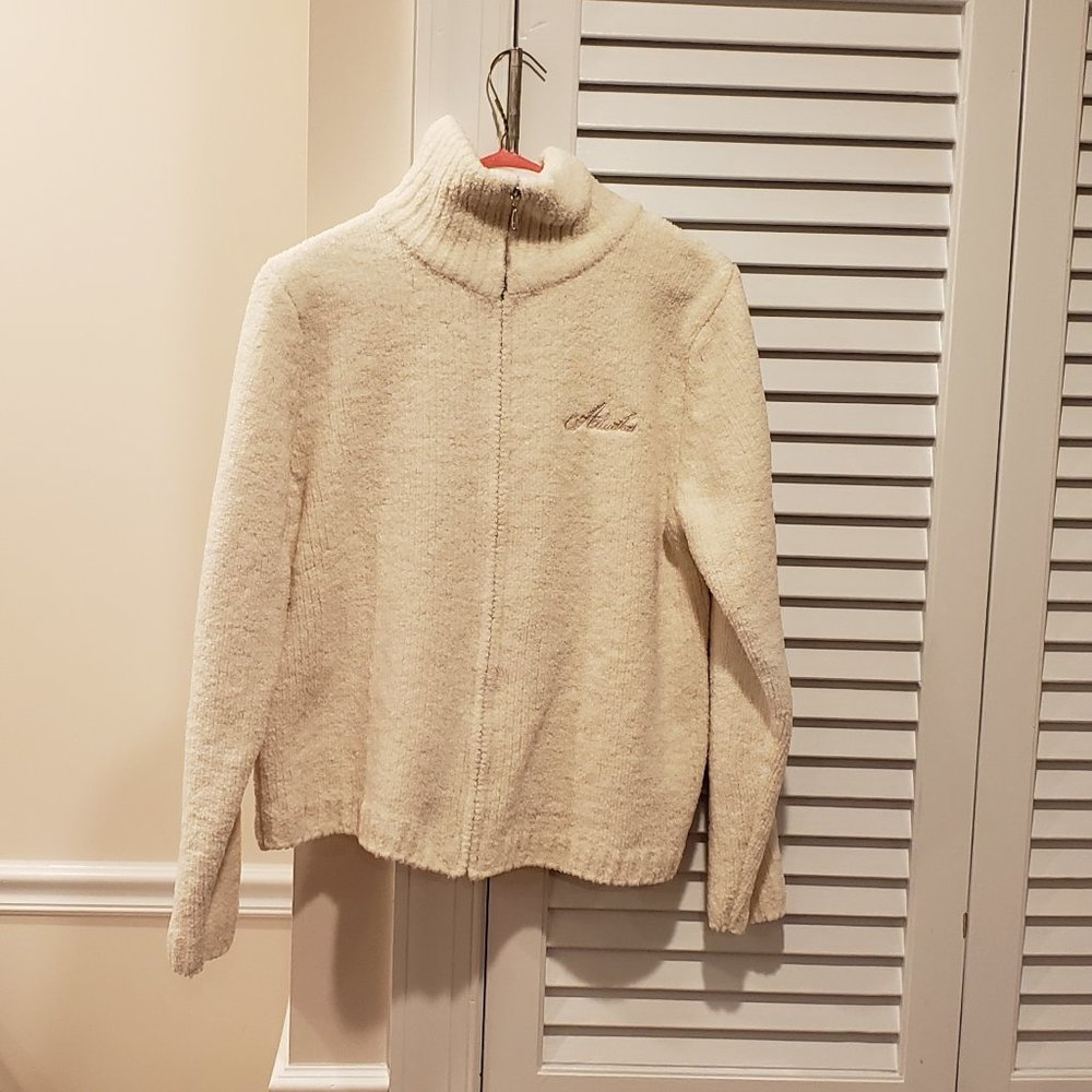 Cream colored mock turtle neck jacket with zipper down front and "Alaska" embroidered on left upper side. 100% polyester.