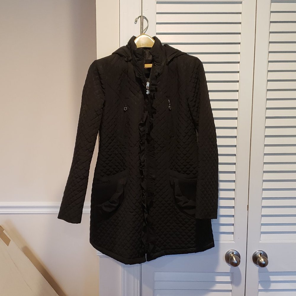Black quilted above the knee lined hooded jacket. Zip pocket details on top and 2 pockets below. 100% polyester.