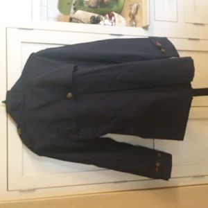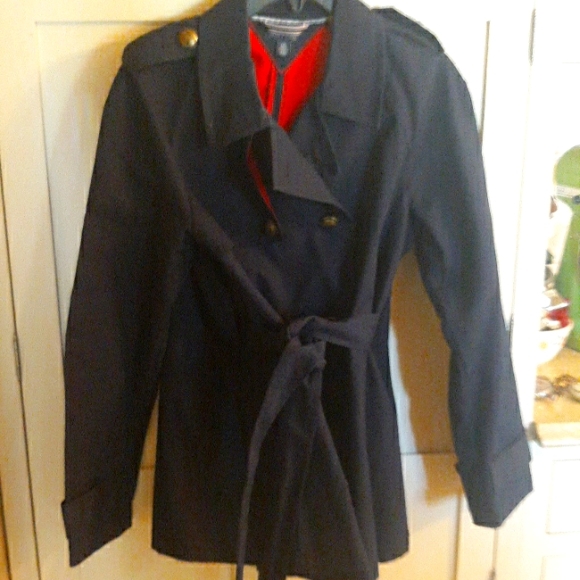 tommy Hilfiger jacket 28 inches length, belt ties in the front the back does not show the belt only the front, the back drapes free. navy blue