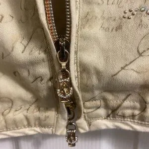 Jeans Jacket. Jeweled and Beaded. Two zipper front\ with jeweled and gold beading accents . Jeweled zipper tags with silver and white trimmings and jeweled buttons on cuffs. Side zippers with jeweled accents. French inscriptions.