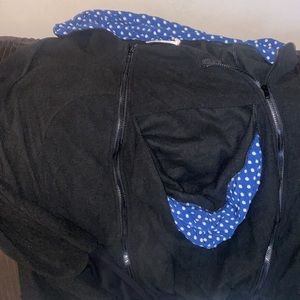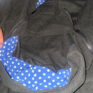 This is a black With blue and white polkadots extra department in the front on the side lots of different zippers awesome jacket