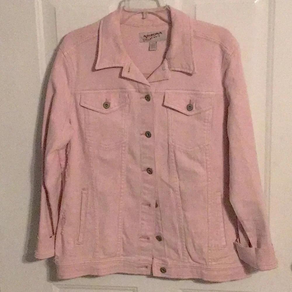 Arizona denim jacket size L button front light pink color mild decorative rips on sides and sleeves