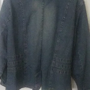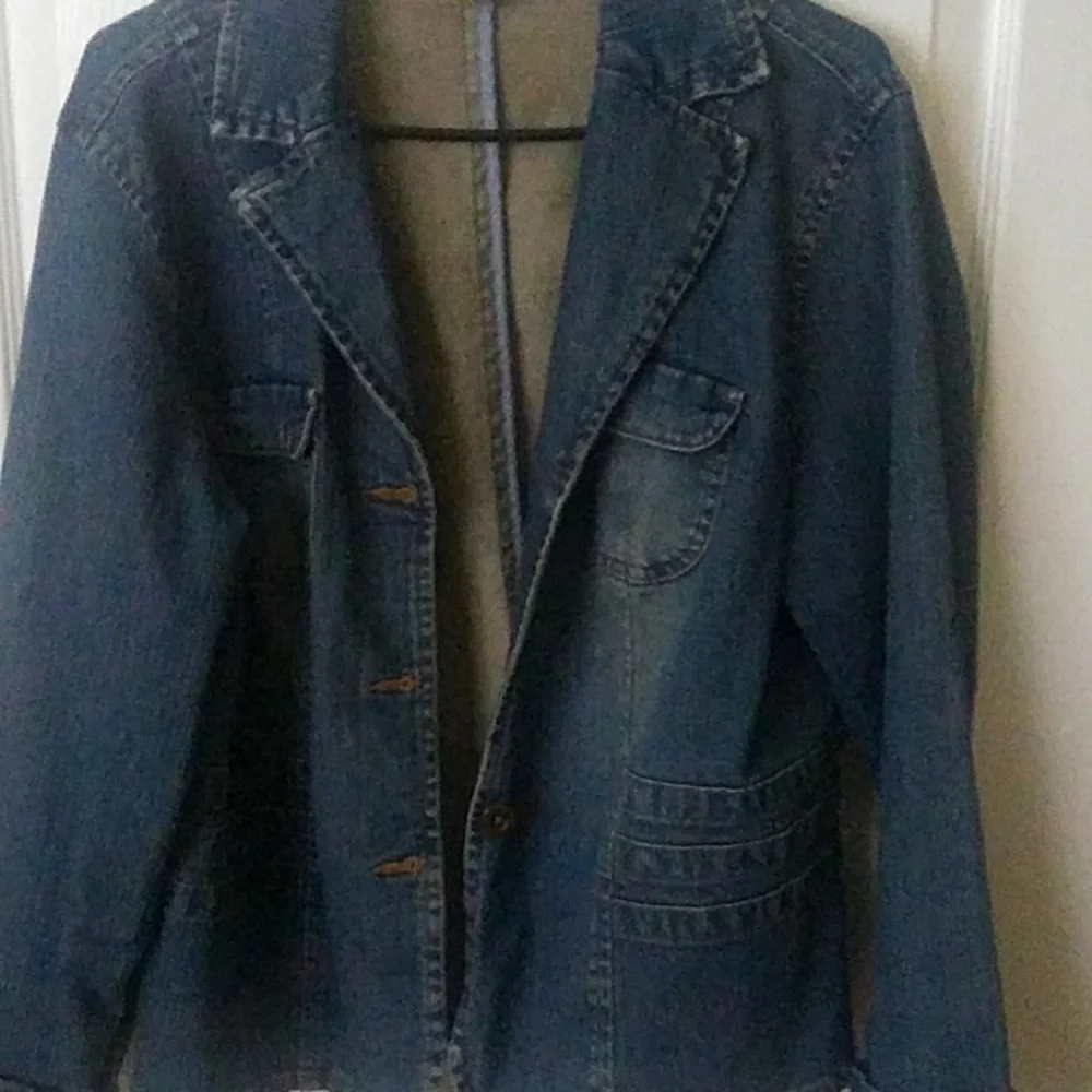 denim jacket with notched collar. stitching accent at waist through the back giving a more shapely silloette. comes down to hips