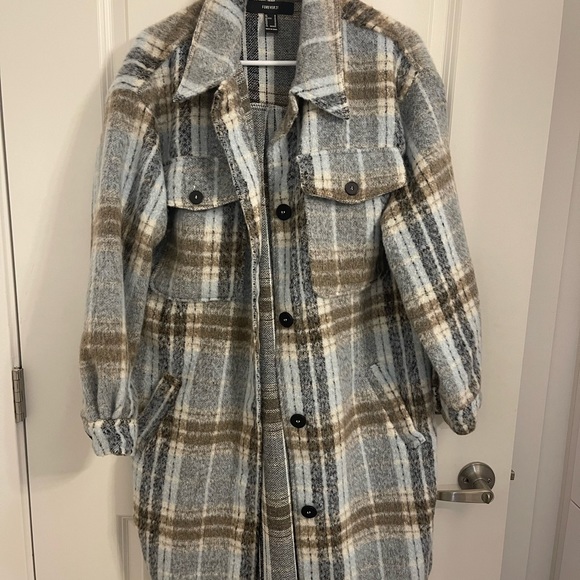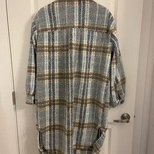 Soft blue plaid jacket. Only worn once. Size medium. I am 5’5 and the length reaches my mid calf.