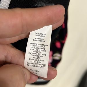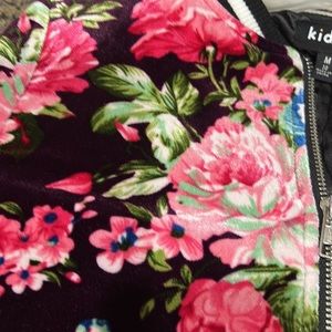 Kidpik jacket, velvet seal, satin lining, flowers are different shades of pink there’s a bit of blue, the background is like burgundy, the neck and sleeves are lined with black and white to make it look athletic, worn once