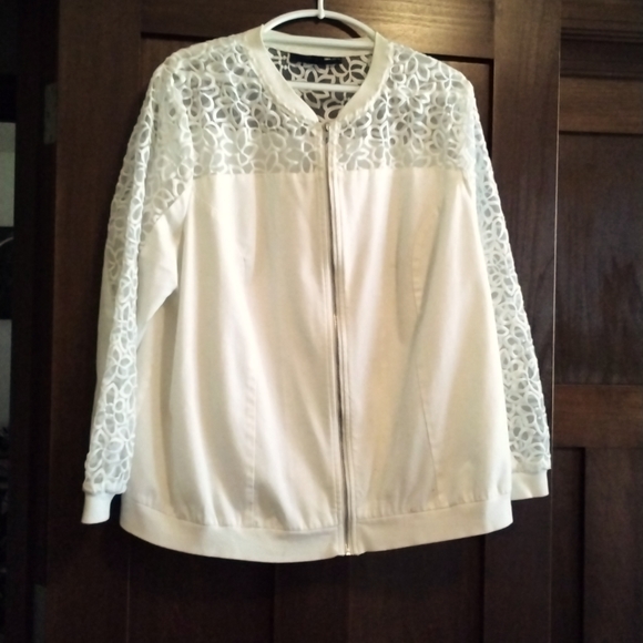 Lightweight jacket with floral print across the shoulders and down the sleeves! Great jacket to wear any time of the year and pairs great with any color top to make the see thru floral pattern pop!